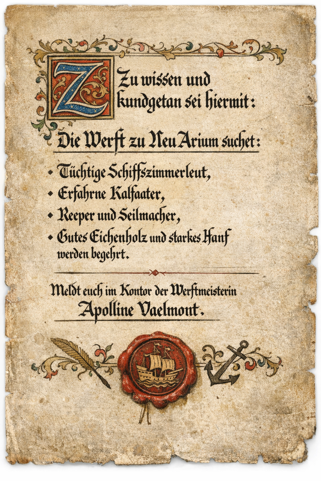 Die ehrbare Werft zu Neu Arium beabsichtigt den Bau zweier hochseetüchtiger Karavellen, bestimmt für weite Fahrt über offenes Meer.