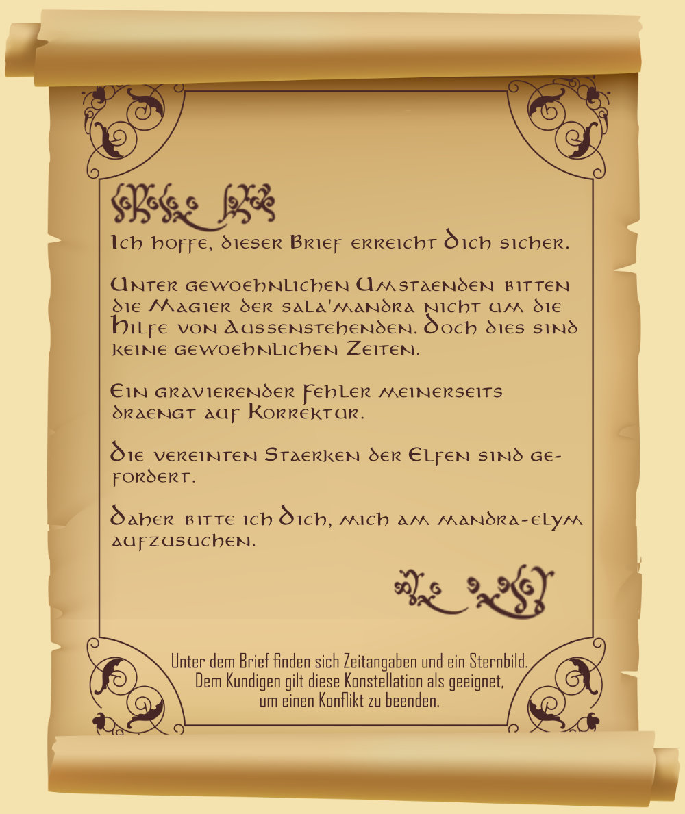 Wenige Stunden später hatten sie den Lichtelfen Are'vin und die Waldelfen Yllaria und Rilaon gefunden, schwirrten um sie herum bis sie die Briefe in Empfang nahmen.