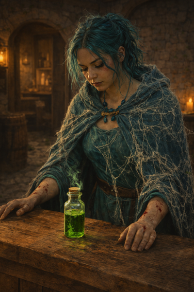 Ich stand noch hinter dem Tresen, als die Tür sich schloss.Der Moment war unspektakulär, und doch blieb er hängen. Der Gast, der soeben gegangen war, hatte über die letzten Wochen einen festen Eindruck hinterlassen – keinen guten. Er war nie laut, nie offen feindselig, doch stets genau einen Schritt zu weit weg von dem, was man noch als akzeptabel bezeichnen konnte. Seine Worte waren scharf, ohne erhoben zu werden, seine Art unangenehm, ohne je eindeutig übergriffig zu sein. Gerade so innerhalb der Grenzen – und genau deshalb schwer zu greifen. Und dennoch hatte ich ihn nicht des Hauses verwiesen. Auch heute nicht. Vielleicht, weil ein Haus wie dieses mehr aushalten muss als angenehme Gäste. Vielleicht aber auch, weil ich neugierig war. Denn bevor er ging, äußerte er einen Wunsch, der sich nicht so einfach abtun ließ. Er wollte ein Gift – nicht zum morden, nicht aus Hinterlistigkeit, sondern mit einer beinahe sachlichen Selbstverständlichkeit, als bestelle er ein besonders ausgefallenes Getränk. Dabei hatte er, fast nebenbei, hinzugefügt, dass er eine Vorliebe für Spinnengift entwickelt habe und dieses sogar trinken würde. Ich erinnere mich, dass ich ihn einen Moment lang einfach nur angesehen habe. Nicht, weil mich der Wunsch schockiert hätte, sondern weil ich kurz überlegte, ob er verstand, was er da eigentlich verlangte. Ich nehme an, er tat es nicht. Er wusste vermutlich nicht, dass ich nicht nur Wirtin bin, sondern früher, in einem anderen Leben, andere Dinge hergestellt habe als Most. Und er wusste ganz sicher nicht, dass Spinnentoxine in den seltensten Fällen für den Verzehr geeignet sind. Die meisten sind entweder zu schwach, zu instabil oder so spezifisch, dass sie im menschlichen Körper kaum mehr als ein leichtes Kribbeln hinterlassen – oder deutlich mehr, je nachdem, wie schlecht man arbeitet. Doch ich wäre nicht die Wirtin dieser Taverne geworden, wenn ich Wünsche meiner Gäste einfach so abtäte. Und auch wenn dieser spezielle Dunkelelf ganz klar nicht zu meinen Lieblingsgästen zu zählen war, so sah ich es trotzdem fast als meine Pflicht an, diesem Wunsch wenigstens ein paar weitere Gedanken zu schenken. Also beschloss ich, es zu versuchen. Und – was ich mir zu diesem Zeitpunkt noch nicht eingestehen wollte – ich war neugierig, ob ich es besser konnte.