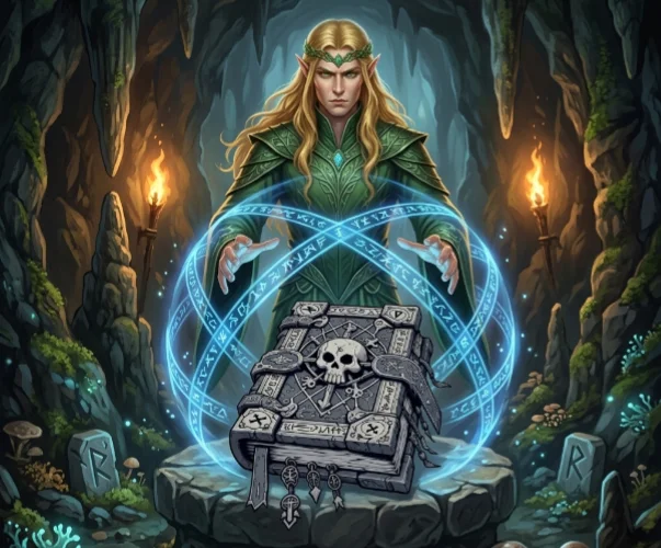 Ein dutzend Male war E'lessar bereits in die Höhle zurückgekehrt. Jedes Mal hatte er Schutzzauber durch andere ersetzt, fein geschwungene Runen in den Boden der Höhle gezeichnet, abgewartet. Doch nichts war geschehen. Das Buch blieb still, auch wenn E'lessar nie den Eindruck ganz abschütteln konnte, als würde es ihn beobachten. Nicht jedes mandra, in den er das Artefakt hüllte war nurdraza taubraza die Magie des Schutzes gegen Untote. Auch das uida mandra sanya’ray war zwischen die Seiten des Buches gewoben. Mit jeder verflossenen Stunde würde die Magie des Buches ihm verständlicher werden, Faden um Faden, Stern um Stern. Ob das reichen würde? Er wusste es nicht, und er plante auch nicht, es herauszufinden. In den folgenden Tagen verbreitete sich die Kunde im Yewwald, unter den Elfen, aber auch unter den Freunden der Elfen: In den Tiefen der Krypta von Yew haben die Elfen einen machtvollen Untoten angetroffen. Dieser widersetzte sich dem Ansturm aus mandra und thara (Zauber und Waffe). In einem alten Tagebuch offenbarte er, dass er seine Seele in 4 Phylakterien gebannt habe. Eines dieser Phylakterien konnten die Elfenstreiter bannen.Nun sucht der Bund der Wachenden Elfen, die sich berufen fühlen, bei der Suche nach den anderen drei Artefakten zu helfen, oder die sich zutrauen, aus dem geborgenen Phylakterium den Standort der anderen zu erkennen.