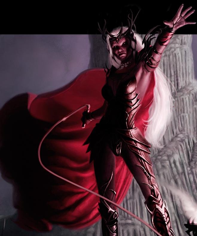Mit einer Geste hob sie beide Hände. Der Boden selbst barst auf, Spalten rissen durch den Thronsaal, und aus ihnen schossen Fäden aus schwarzer Energie – Spinnennetze aus Flamme und Schatten. Sie spannten sich um Shinayna, zogen sich enger, schärfer, bis sie in ihr Fleisch schnitten. Die Matriarchin Zauviir schrie, wand sich, versuchte die Netze mit Feuer zu verbrennen, doch das Netz fraß ihre Magie, trank ihre Zauber wie Blut. Ihre Peitsche fiel klirrend zu Boden, ihre Knie gaben nach.