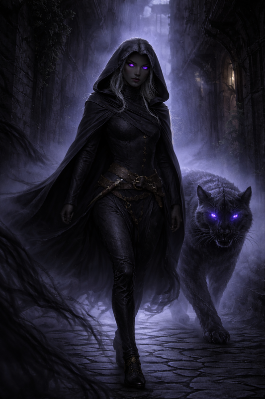 Zynrae glitt mit fast lautlosen Schritten über den dunklen Steinboden, als sie sich zielstrebig auf den Weg zum Treffpunkt machte. Sie trug ihre enge, schwarze Lederrüstung, die sich wie eine zweite Haut an ihren Körper schmiegte. Das matte Leder schluckte das Licht, sodass sie besser mit den Schatten verschmelzen konnte. Ein langer, dunkler Umhang umhüllte sie und verbarg sowohl ihre Ledertasche als auch ihre auffälligen weißen Haare. Nur der kleine Dolch an ihrer Hüfte fing gelegentlich einen schwachen Lichtstrahl ein. Kurz hatte sie überlegt, einen Stab mitzunehmen, diesen Gedanken dann aber wieder verworfen. Im Zweifel war es wichtiger, die Hände frei zu haben. Wesen, die so nah an sie herankamen, bedeuteten für sie ohnehin nur das eine: Ihren letzten Fehler hatte sie bereits begangen. Ihr Gesichtsausdruck verriet ihre volle Konzentration. Die Stirn war in Falten gelegt, die Augen leicht verengt und wachsam. Es war eine der ersten unerbitterlichen Lektionen in ihrer Ausbildung gewesen: Wer sich nicht gut genug fokussieren konnte, war früher oder später tot. Ein Zustand, der weder Raum für Angst oder Wut ließ, sondern allein von Kontrolle geprägt war. Jeder ihrer dumpfen Schritte erzeugte ein kleines Echo in ihrem Inneren. Sie hatte heute Morgen mit dem Abstieg in ihre Magie begonnen und nutzte nun jeden Schritt, um noch tiefer einzutauchen. Ein starker Manastrom summte durch ihren Körper, und mit jedem Schritt wuchs der Druck in ihr weiter an. Es war ein schmaler Grat. Es musste stark genug sein, damit sie im richtigen Moment darauf zugreifen konnte. Doch zu viel würde ihr Schmerzen bereiten, sie schwächen und ihre Konzentration stören. Schon jetzt spürte sie, dass sie ihre Belastungsgrenze beinahe erreicht hatte. Es war ein Geräusch, kaum mehr als ein leises Kratzen. Aber es war nur für sie bestimmt, und sie hatte bereits darauf gewartet. Daher reagierte sie sofort. Ihre Hand griff routiniert in ihren Schatten, und ein feiner Manastrom floss in die Dunkelheit hinein. „Al'doer Elir“, flüsterte sie. Der Schatten begann sich zu verdichten, dann glitt lautlos eine Gestalt daraus hervor: Ein Panther setzte geschmeidig einen Fuß nach dem anderen auf den kalten Steinboden, sein dunkles Fell aus dunklen Schwaden geformt. Seine violetten Augen fanden sofort ihre. Eine vertraute Verbindung. Zynrae ließ vorsichtig eine kleine Menge ihrer Magie zu ihm fließen. Erleichtert seufzte sie kurz auf, als der Druck in ihr abnahm. Ihre Blicke blieben fest verankert, als er seine Zähne entblößte und ein tiefes, lautes Fauchen die Stille erfüllte. Er war bereit. Ohne ein weiteres Zögern setzten sie sich in Bewegung. Zynraes Schritte blieben ruhig und bestimmt. Sie würde ganz sicher nicht als Erste umkehren.